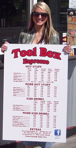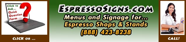 Full Color Espresso Business Menus mounted on professional all weather aluminum layered sign board.